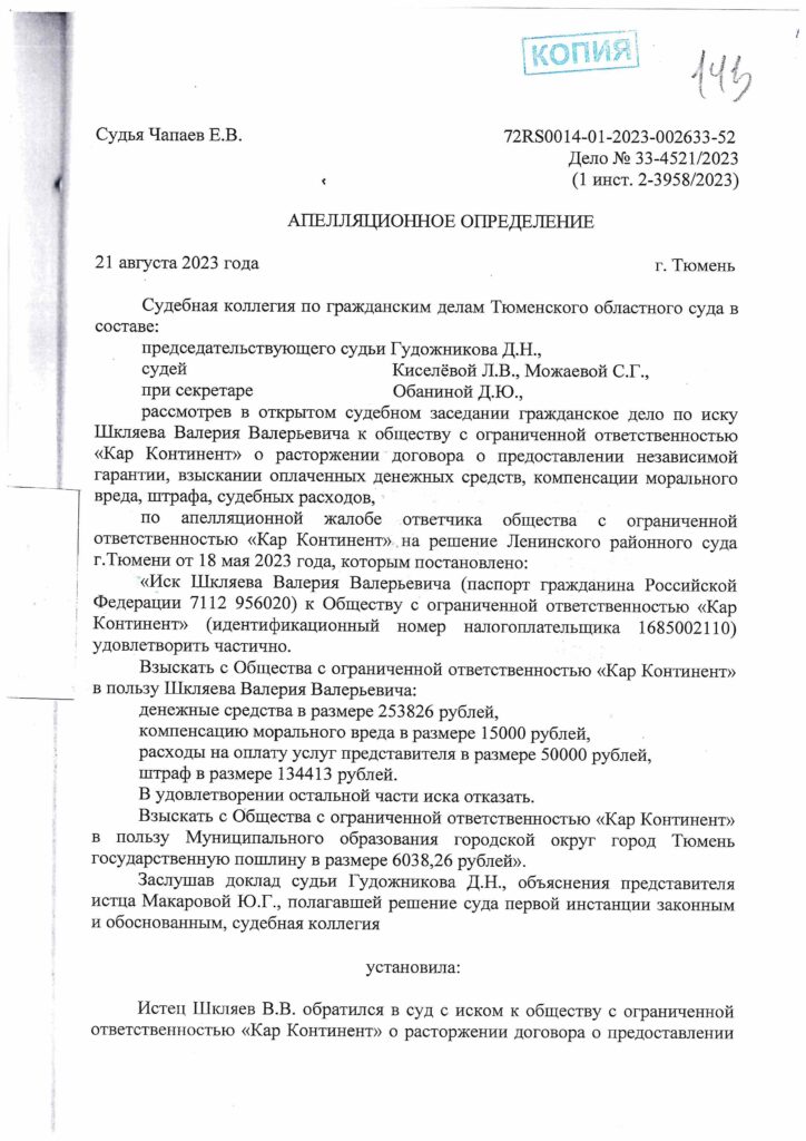 Судебная коллегия по гражданским делам Тюменского областного суда рассмотрела апелляционную жалобу ООО «Кар Континент» на решение Ленинского районного суда г. Тюмени по иску Шкляева В.В. о расторжении договора, взыскании уплаченных средств, компенсации морального вреда и штрафа. Определением суда апелляционной инстанции решение первой инстанции оставлено без существенных изменений: иск частично удовлетворён, взысканы сумма договора, моральный вред, расходы на представителя и штраф.