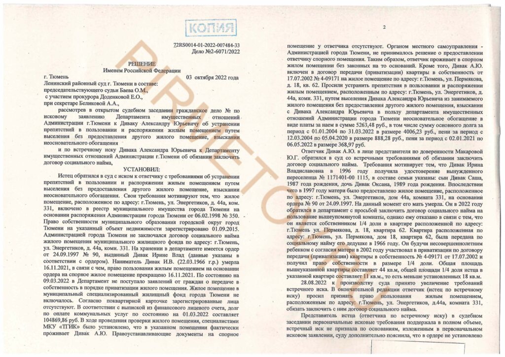 Ленинский районный суд г. Тюмени рассмотрел иск Департамента имущественных отношений Администрации г. Тюмени к Диваку Александру Юрьевичу об устранении препятствий в пользовании муниципальной квартирой, выселении без предоставления другого жилого помещения и взыскании неосновательного обогащения за проживание без законных оснований. Суд установил отсутствие у ответчика права на данное жильё и взыскал плату за пользование помещением.