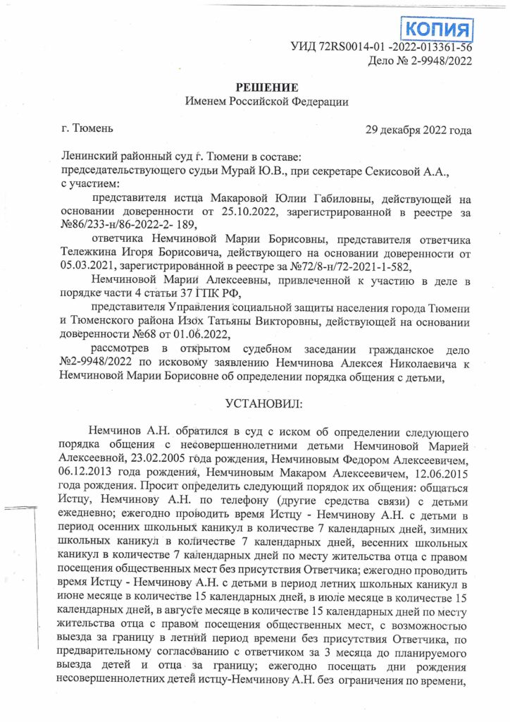 Ленинский районный суд г. Тюмени рассмотрел дело по иску Немчинова Алексея Николаевича о порядке общения с несовершеннолетними детьми: Марией (2005 г.р.), Федором (2013 г.р.) и Макаром (2015 г.р.). Истец просил установить график общения по телефону ежедневно и встречи в период школьных каникул, а также возможность выезда детей за границу с отцом без препятствий со стороны матери. Суд определил детальный порядок общения, включая периоды каникул и посещения без присутствия ответчицы.