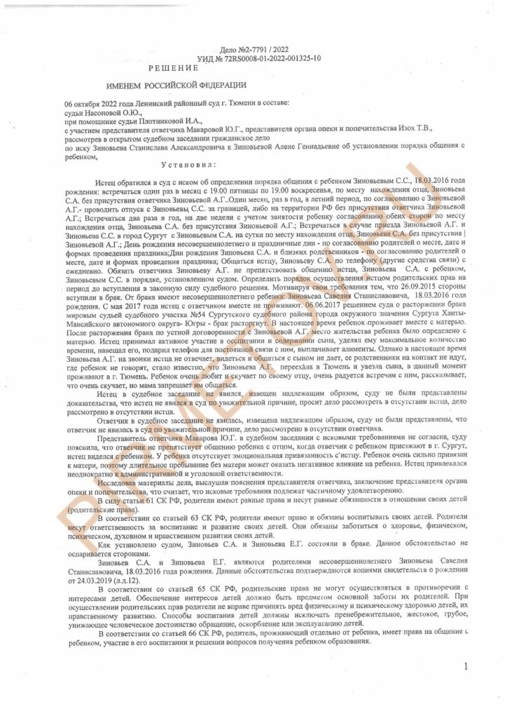 Ленинский районный суд г. Тюмени рассмотрел дело по иску Зиновьевой Станиславы Александровны к Зиновьевой Анеле Геннадьевне об установлении порядка общения с сыном. В ходе рассмотрения дела суд учёл позицию органов опеки и попечительства, возраст ребёнка и другие обстоятельства. Суд пришёл к выводу, что ребёнок нуждается в общении с отцом, и установил порядок общения, частично удовлетворив исковые требования истца.