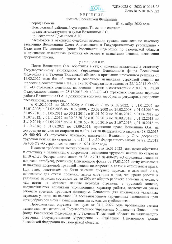 Центральный районный суд г. Тюмени рассмотрел дело по иску Велижанина Олега Анатольевича к Отделению Пенсионного фонда РФ по Тюменской области о признании незаконным решения об отказе в досрочном назначении трудовой пенсии по старости. Истец оспаривал отказ, указывая, что периоды его работы водителем автобуса были исключены из льготного стажа без достаточных оснований. Суд исследовал доказательства, в том числе трудовую книжку, карточки учёта рабочего времени и трудовой договор.