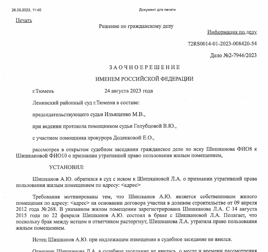 «Постановление суда о признании утратившей право пользования жилым помещением» — это распространённая судебная процедура, которая применяется при спорах о выселении, утрате прав на жильё, освобождении помещения и аналогичных вопросах.