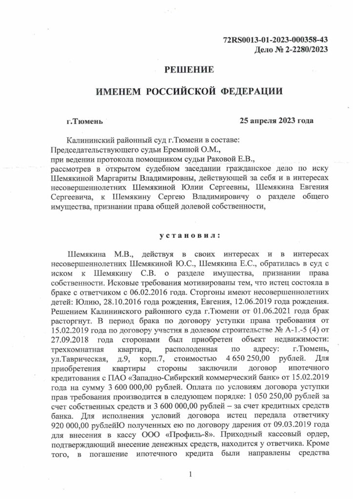 Калининский районный суд г. Тюмени рассмотрел иск Шемякиной Маргариты Владимировны, действующей за себя и в интересах несовершеннолетних детей, к Шемякину Сергею Владимировичу о разделе совместно нажитого имущества и признании права общей долевой собственности. Спор касался квартиры в Тюмени, приобретённой в период брака в ипотеку с частичным погашением из личных средств истца. Суд установил порядок владения и доли в праве собственности с учётом интересов детей.