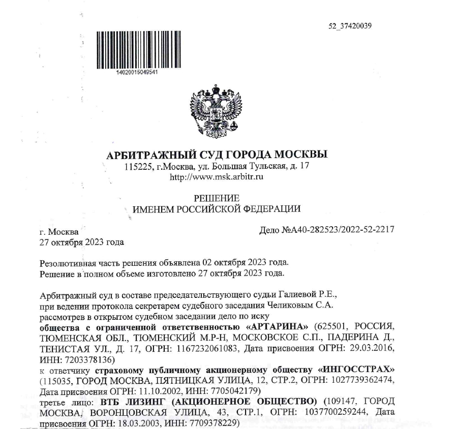 • Решение Арбитражного суда города Москвы по исковому заявлению к компании “Ингосстрах” о взыскании страхового возмещения в связи с повреждением транспортного средства