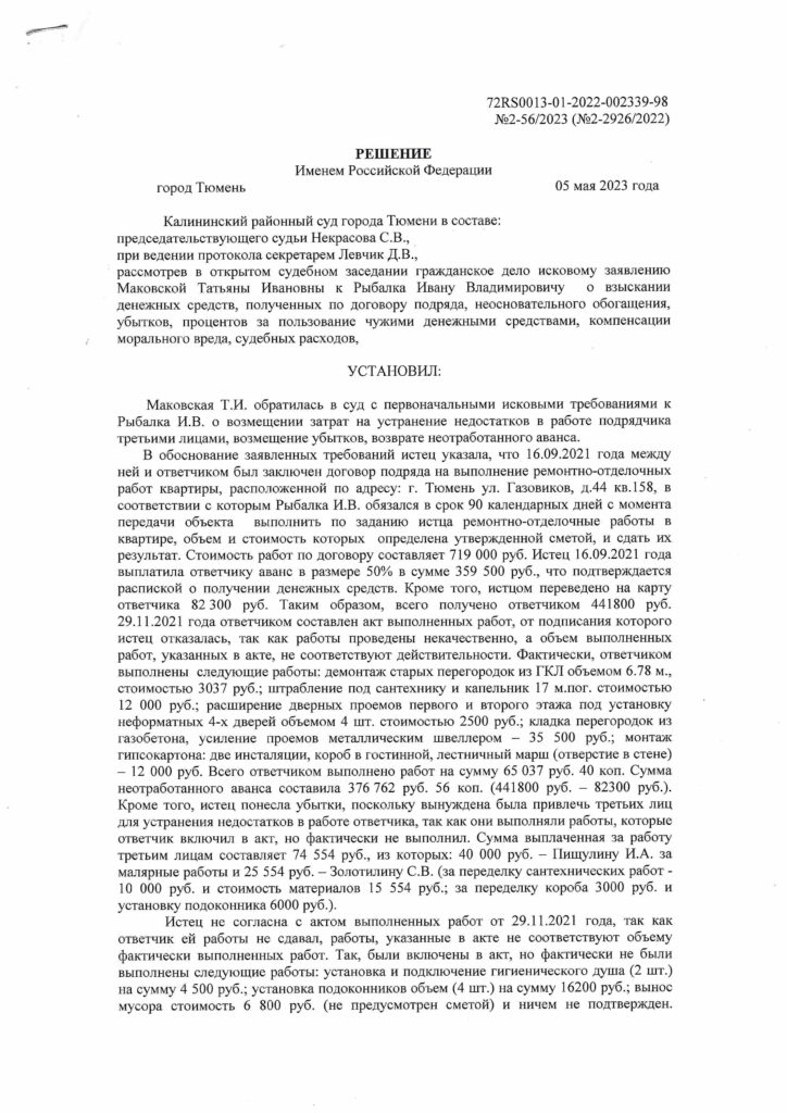 Калининский районный суд города Тюмени рассмотрел иск Маковской Татьяны Ивановны к Рыбалко Ивану Владимировичу о взыскании денежных средств, выплаченных по договору подряда на ремонт квартиры, компенсации убытков, процентов за пользование чужими денежными средствами, компенсации морального вреда и судебных расходов. Суд установил, что часть работ выполнена некачественно и не в полном объеме, поэтому истцу присуждён возврат части аванса и возмещение затрат на устранение недостатков.