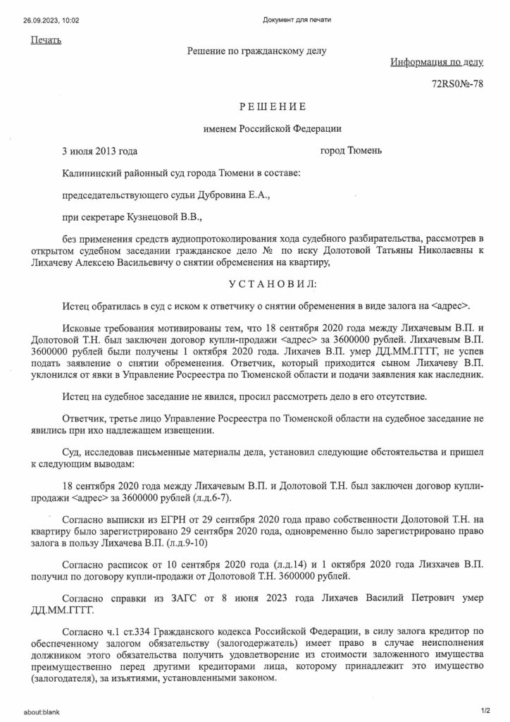 Калининский районный суд г. Тюмени рассмотрел иск Долотовой Т.Н. к Лихачеву А.В. о снятии обременения в виде залога с квартиры, приобретённой по договору купли-продажи. Суд исследовал документы о переходе права собственности и пришёл к выводу о необходимости рассмотрения спора в отсутствие сторон.