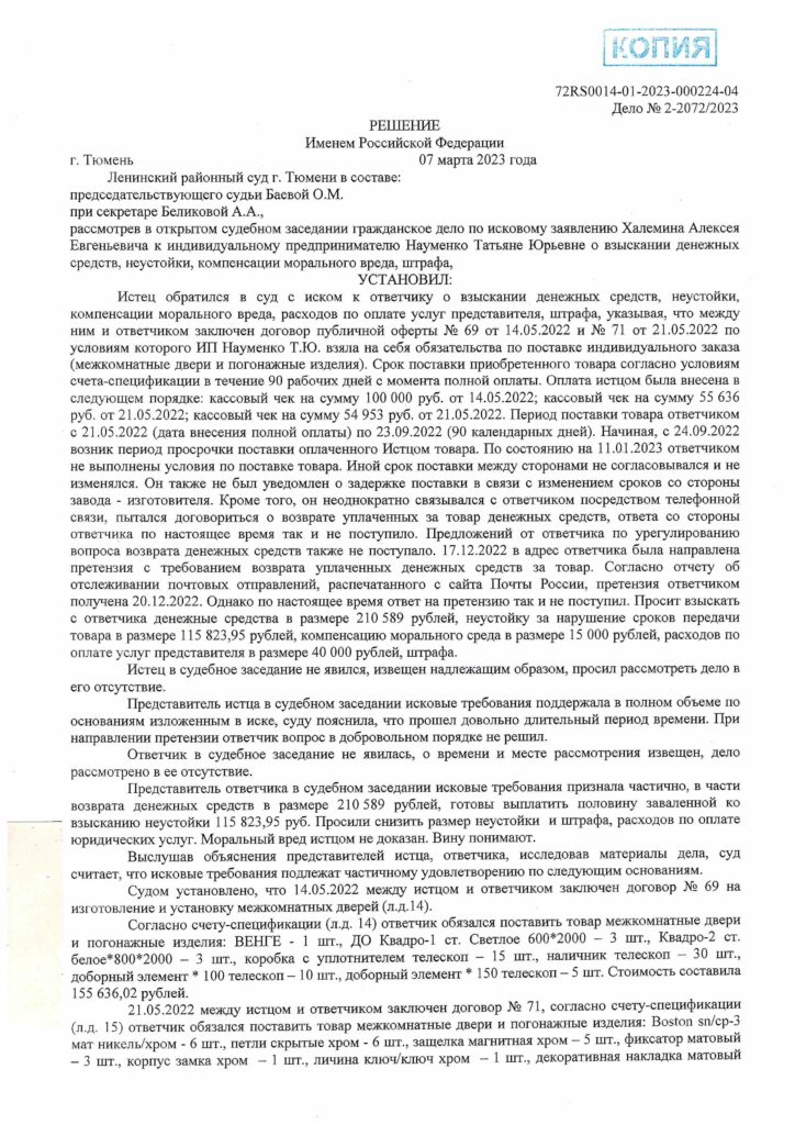 Ленинский районный суд г. Тюмени рассмотрел иск Халемина Алексея Евгеньевича к индивидуальному предпринимателю Науменко Татьяне Юрьевне о взыскании уплаченных денежных средств по договору поставки, неустойки за просрочку исполнения обязательств, компенсации морального вреда, штрафа и расходов на представителя. Суд установил, что условия договора по поставке индивидуального заказа (межкомнатные двери и комплектующие) не были исполнены в установленный срок, товар не был поставлен, в связи с чем требования истца частично удовлетворены.