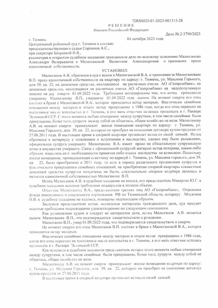 Центральный районный суд г. Тюмени рассмотрел иск Малюганова А.В. о признании права единоличной собственности на квартиру после смерти отца, учитывая фактическое прекращение семейных отношений между супругами. Суд удовлетворил исковые требования, подтвердив право собственности истца.