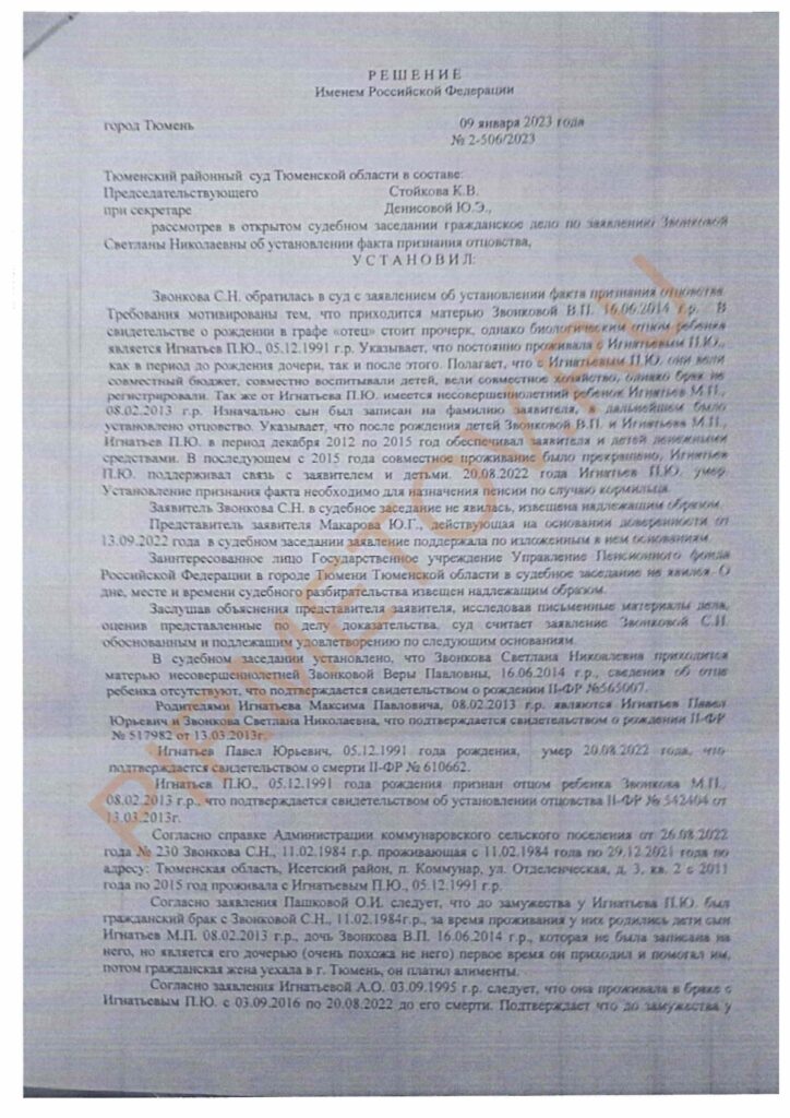 Тюменский районный суд Тюменской области рассмотрел дело по заявлению Звонковой Светланы Николаевны об установлении факта признания отцовства Ингатиевым Павлом Юрьевичем в отношении Звонковой Веры Павловны. Заявительница обратилась в суд для подтверждения права на пенсию по случаю потери кормильца. Суд исследовал свидетельства о рождении, смерти, а также документы органов ЗАГС и подтвердил факт признания отцовства.